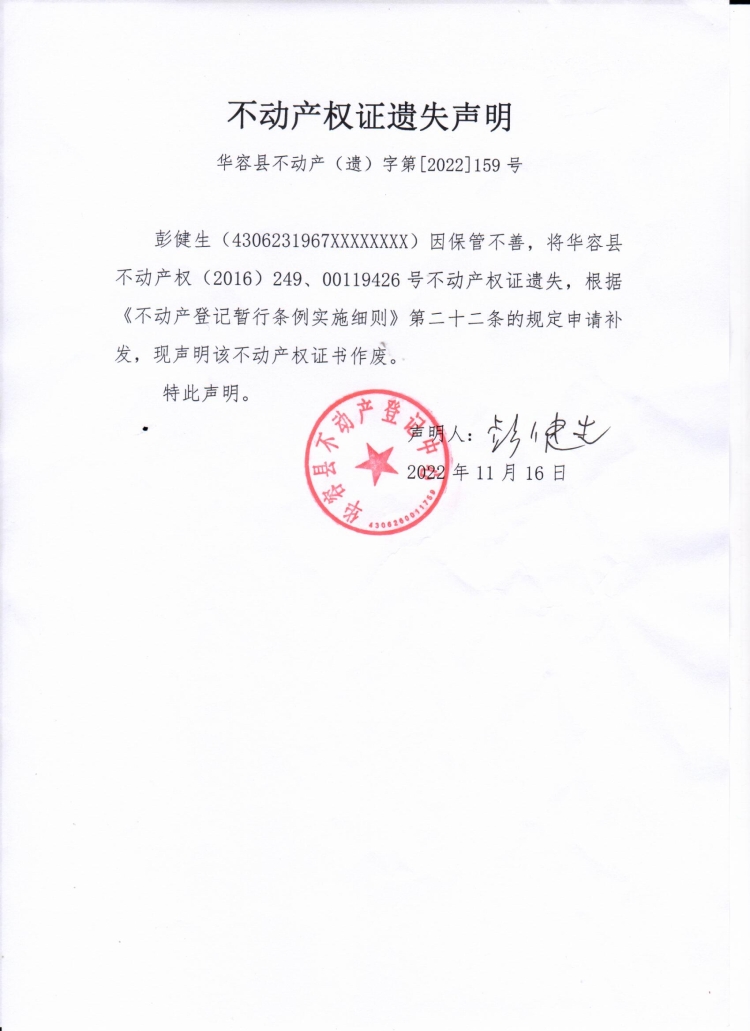 不动产权证遗失声明(彭健生)