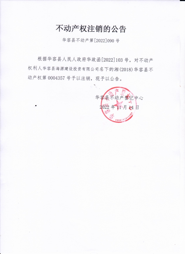 不动产权证注销公告(华容县海源建设投资有限公司)