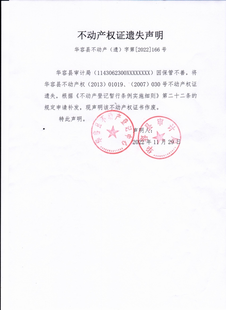 不动产权证遗失声明(华容县审计局)