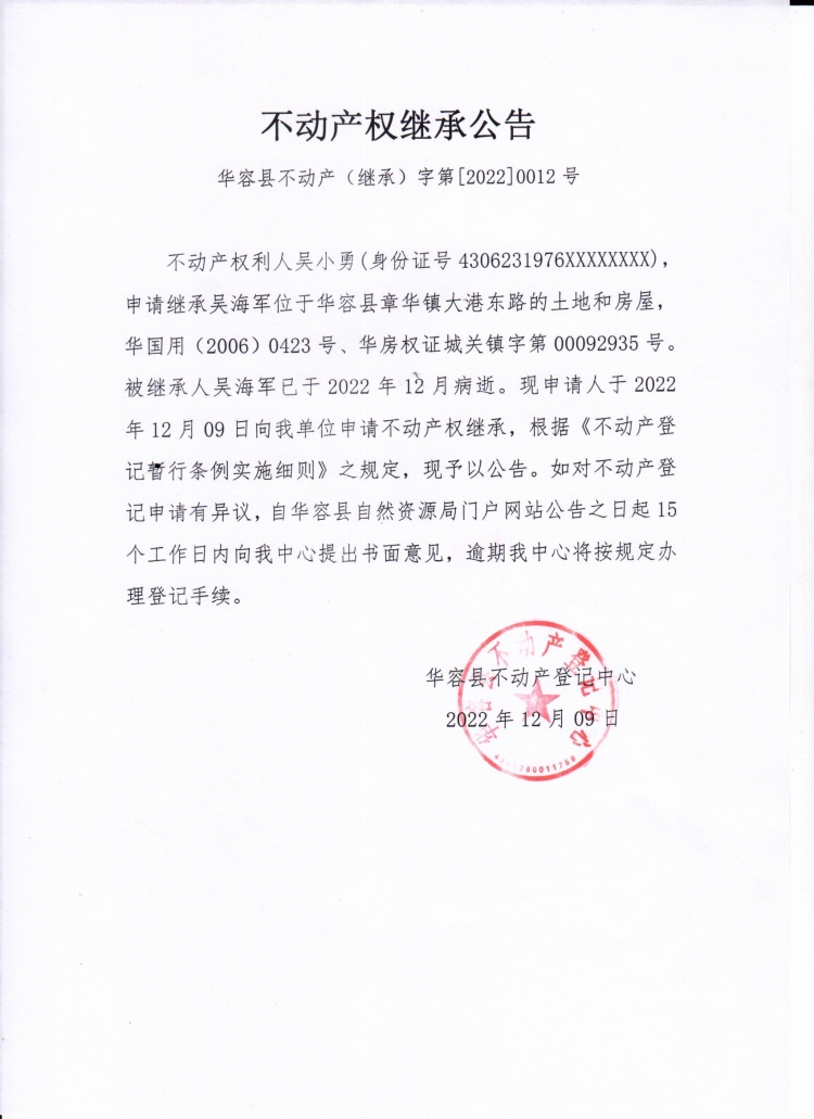 不动产权继承公告(吴小勇)