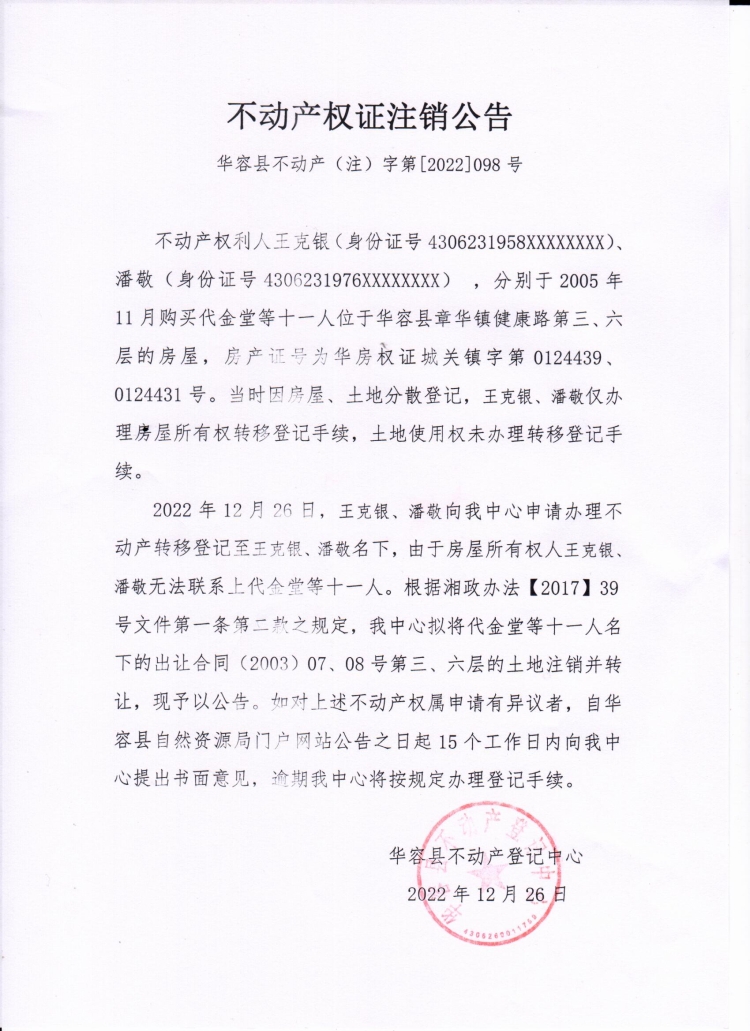 不动产权证注销公告(代金堂等十一人转王克银、潘敬)