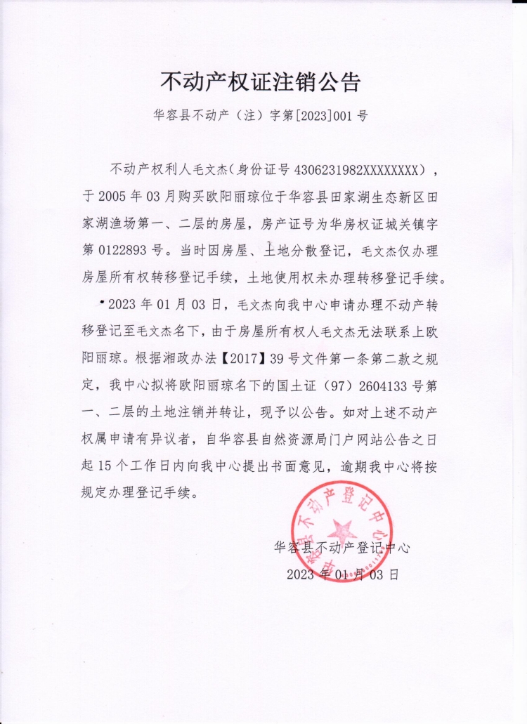 不动产权证注销公告(欧阳丽琼转毛文杰)