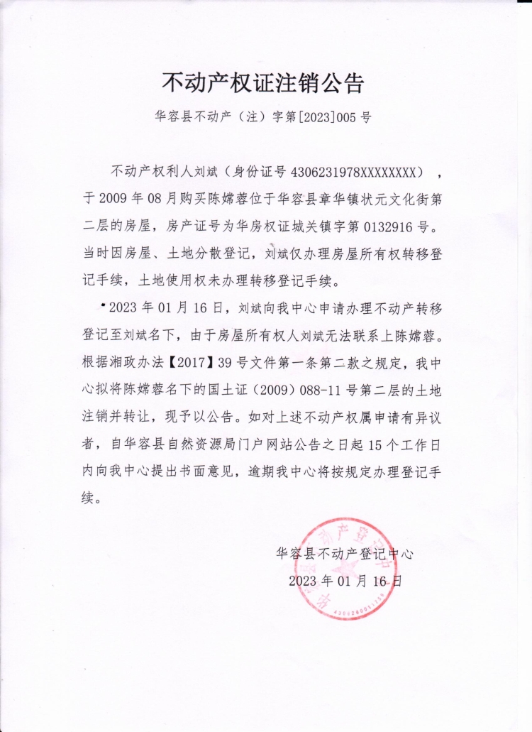 不动产权证注销公告(陈嫦蓉转刘斌)