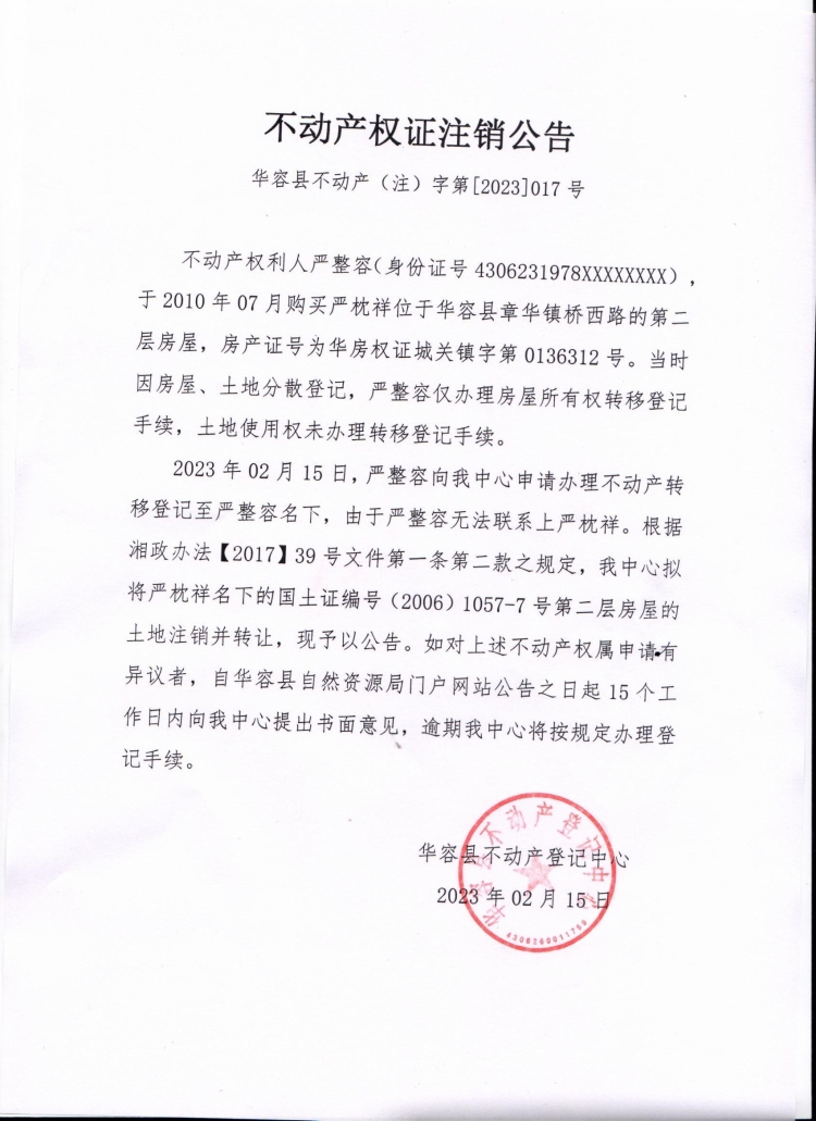 不动产权证注销公告(严枕祥转严整容)