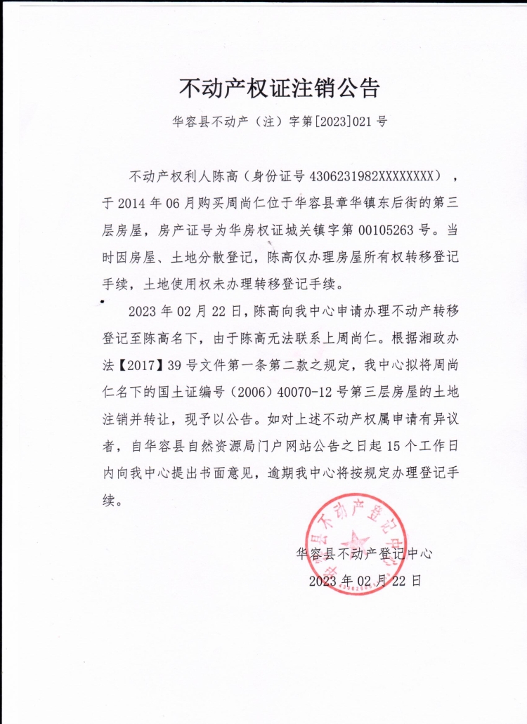 不动产权证注销公告(周尚仁转陈高)