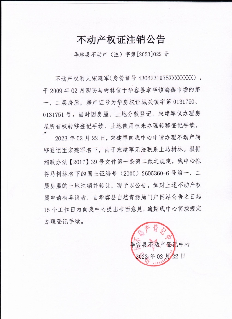 不动产权证注销公告(马树林转宋建军)