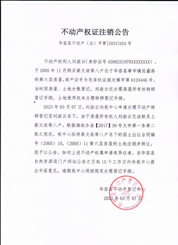 不动产权证注销公告(蔡文政等八户转刘淑云)
