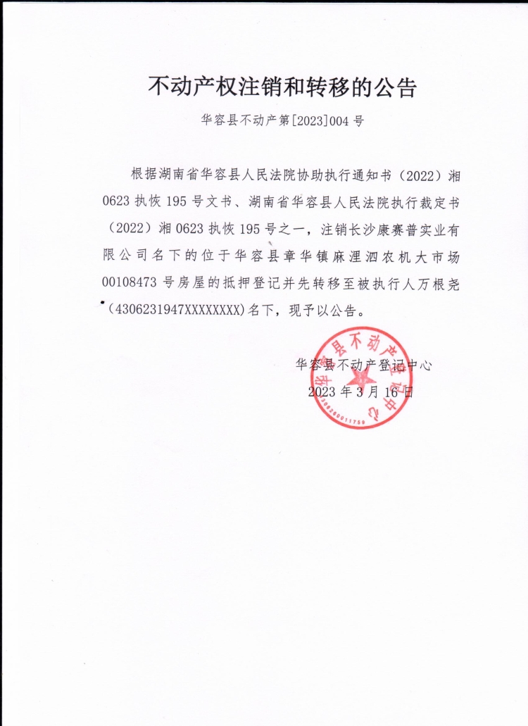 不动产权注销和转移的公告(长沙康赛普实业有限公司转万根尧)
