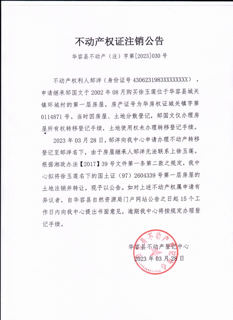 不动产权证注销公告(徐玉莲转邹洋)