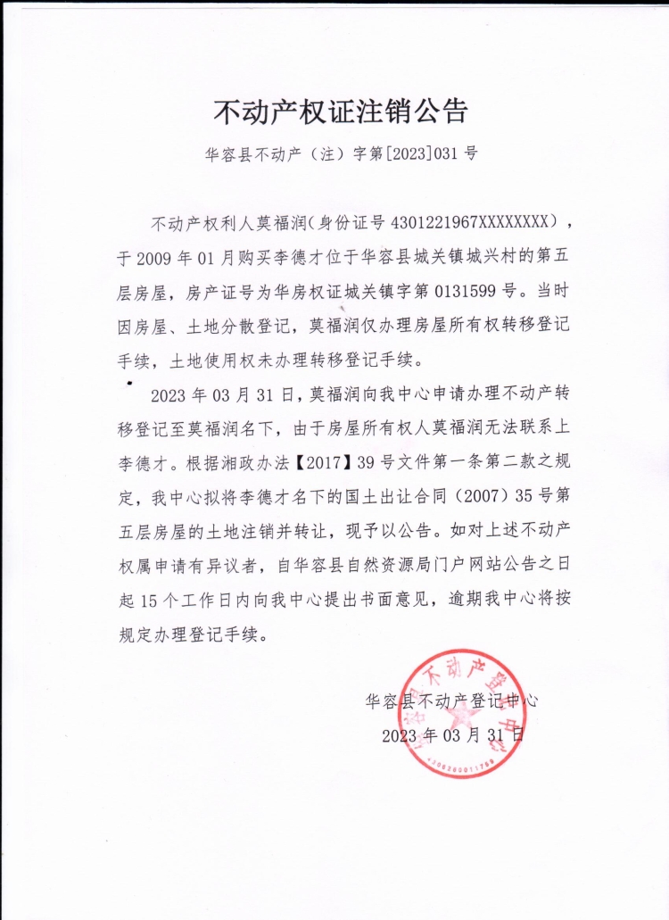 不动产权证注销公告(李德才转莫福润)