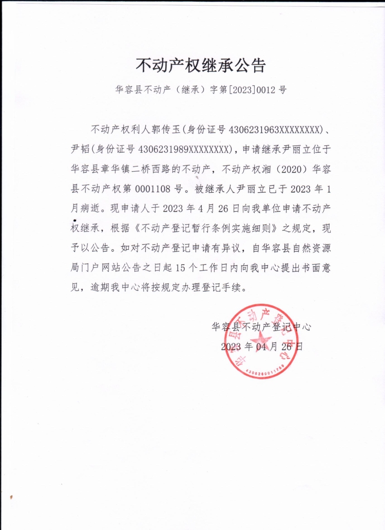 不动产权继承公告(尹丽立转郭传玉、尹韬)