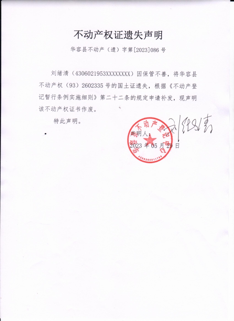 不动产权证遗失声明(刘绪清)