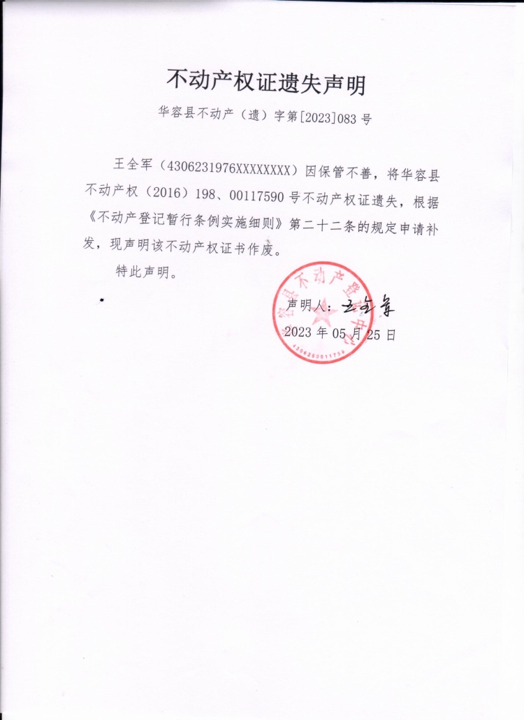 不动产权证遗失声明(王全军)