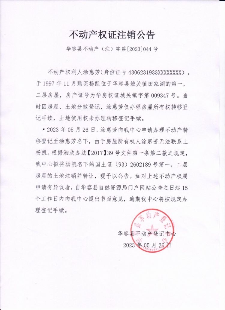 不动产权证注销公告(杨凯转涂惠芳)