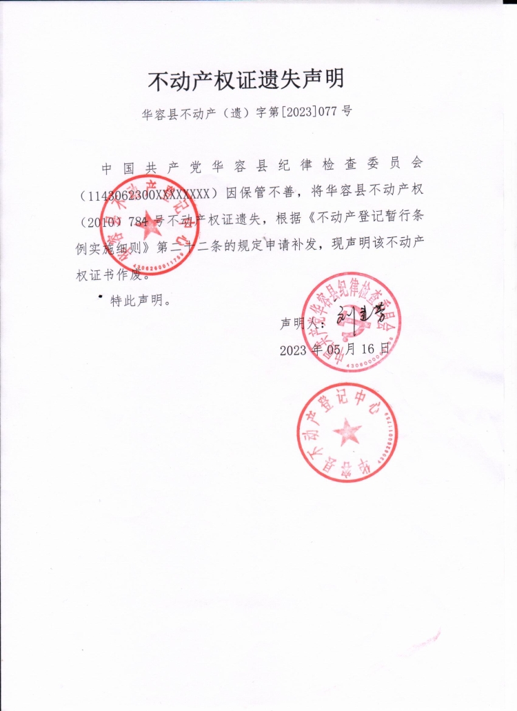 不动产权证遗失声明(中国共产党华容县纪律检查委员会)