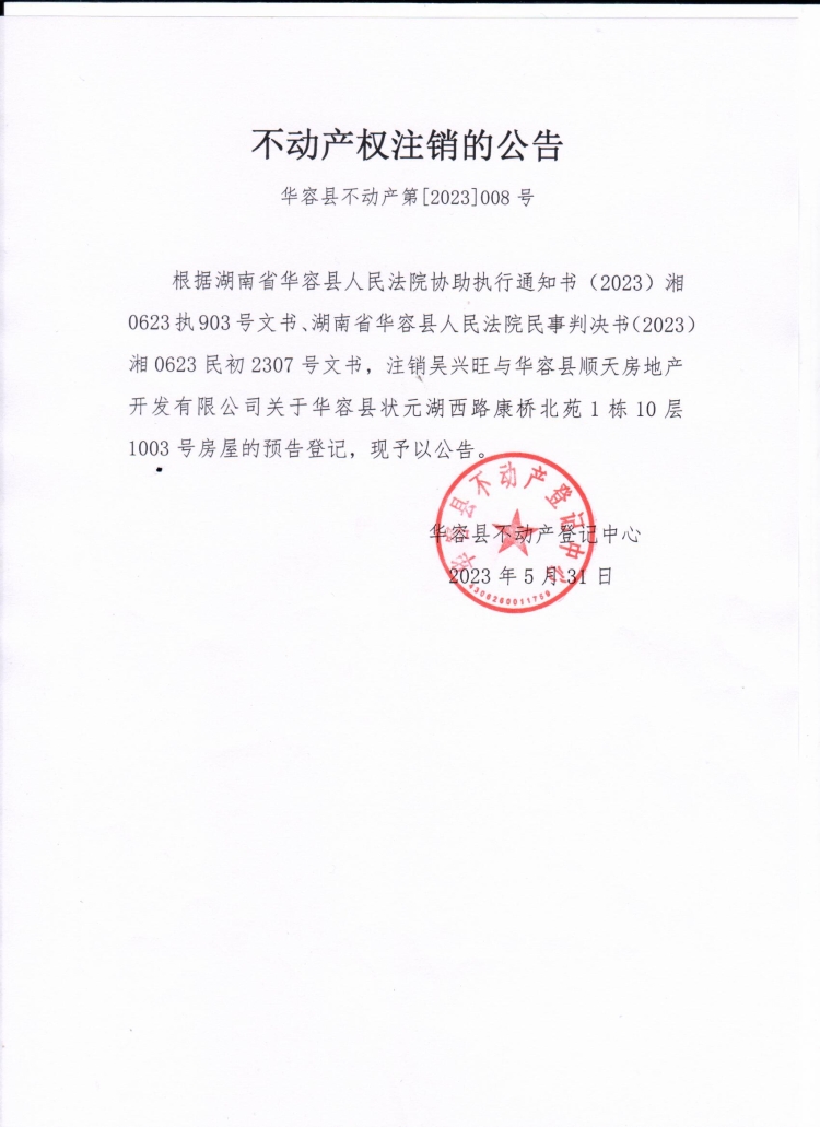 不动产权注销的公告(吴兴旺与华容县顺天房地产开发有限公司)