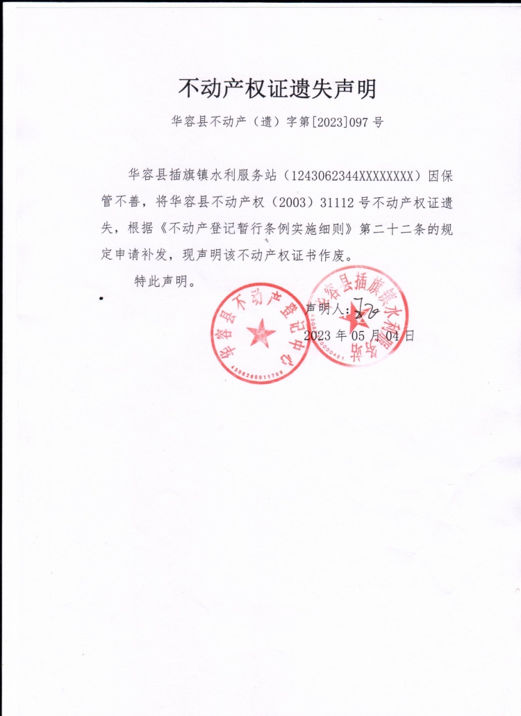 不动产权证遗失声明(华容县插旗镇水利服务站)