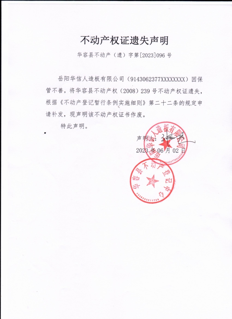 不动产权证遗失声明(岳阳华信人造板有限公司)