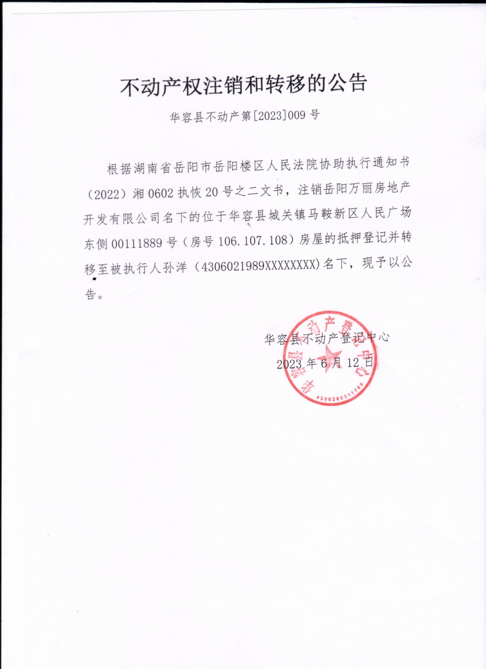 不动产权注销和转移的公告(岳阳万丽房地产开发有限公司转孙洋)