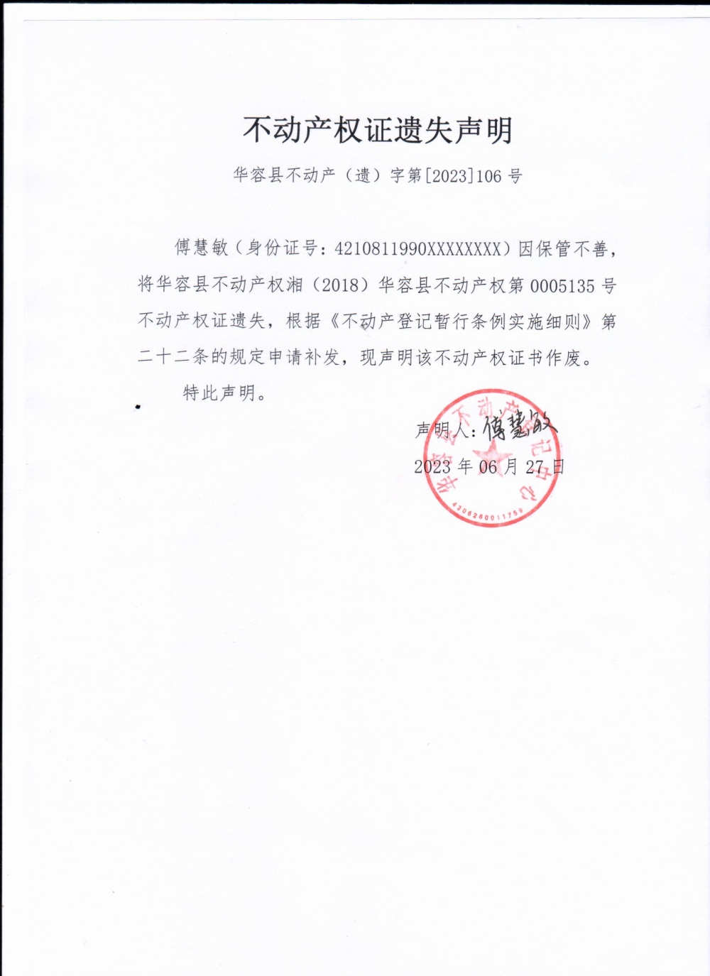 不动产权证遗失声明(傅慧敏)