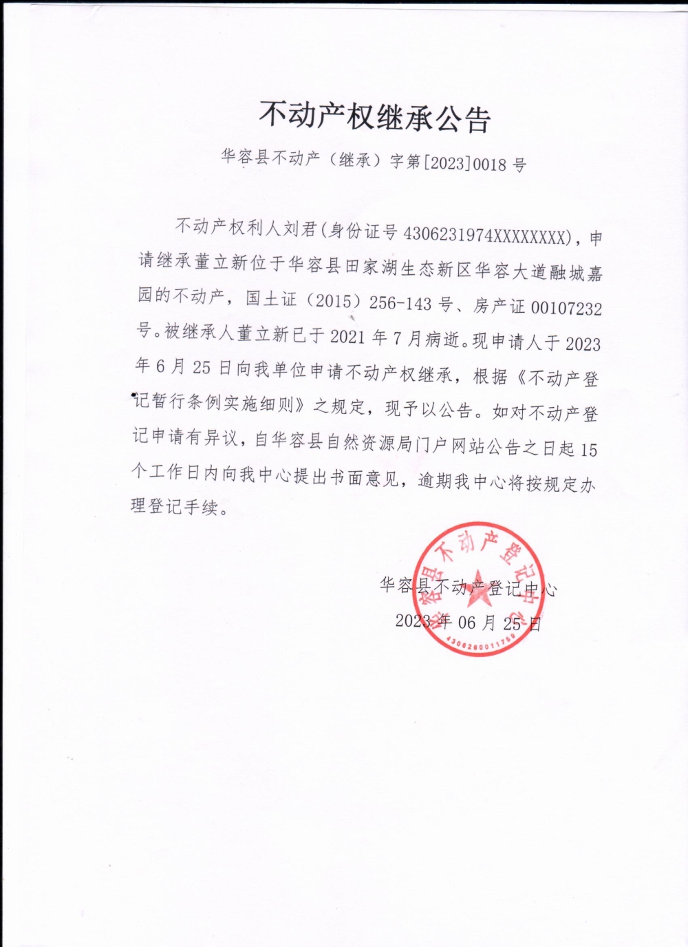 不动产权继承公告(刘君)