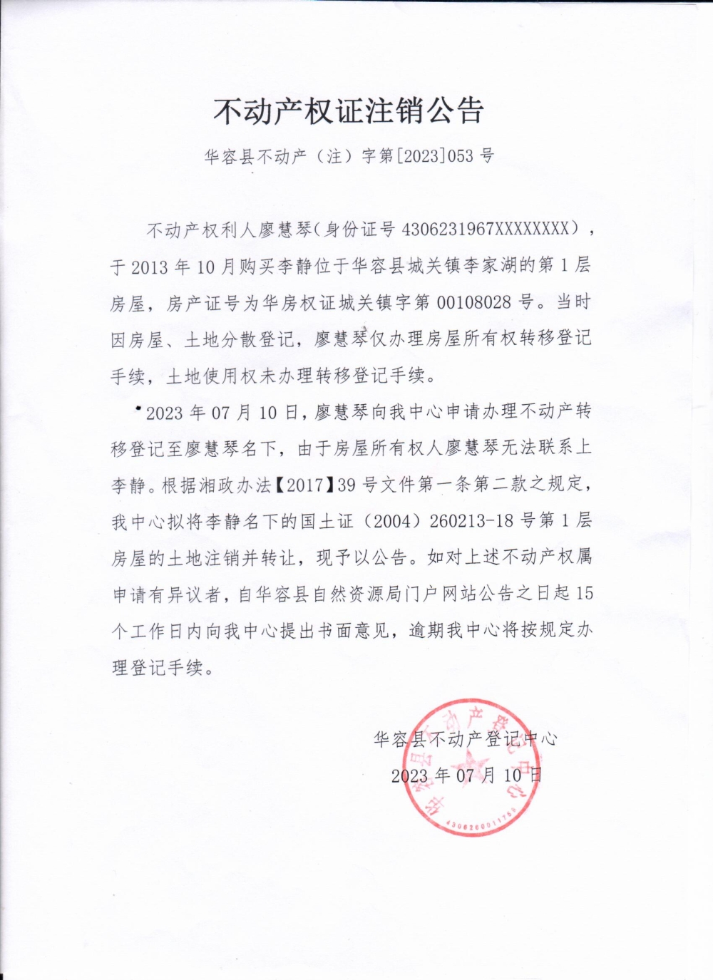 不动产权证注销公告(李静转廖慧琴)