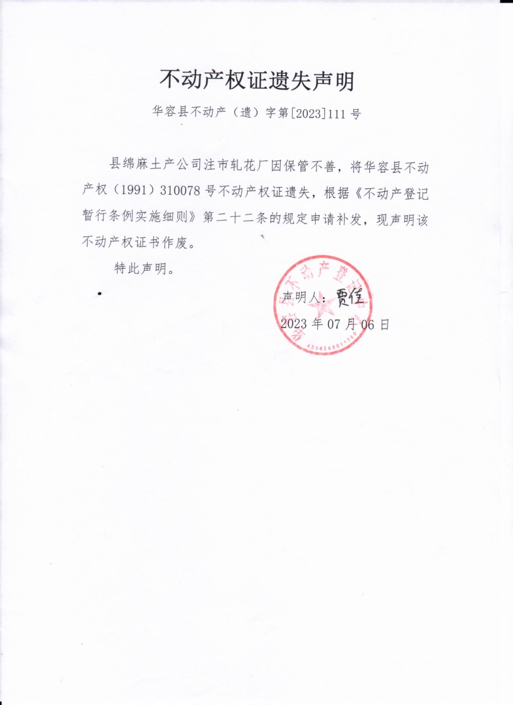 不动产权证遗失声明(县棉麻土产公司注市轧花厂)