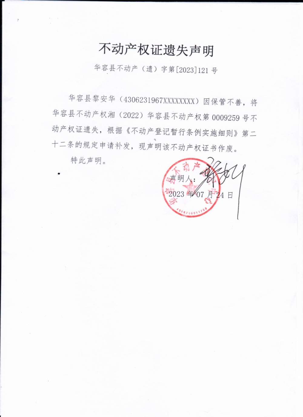不动产权证遗失声明(黎安华)