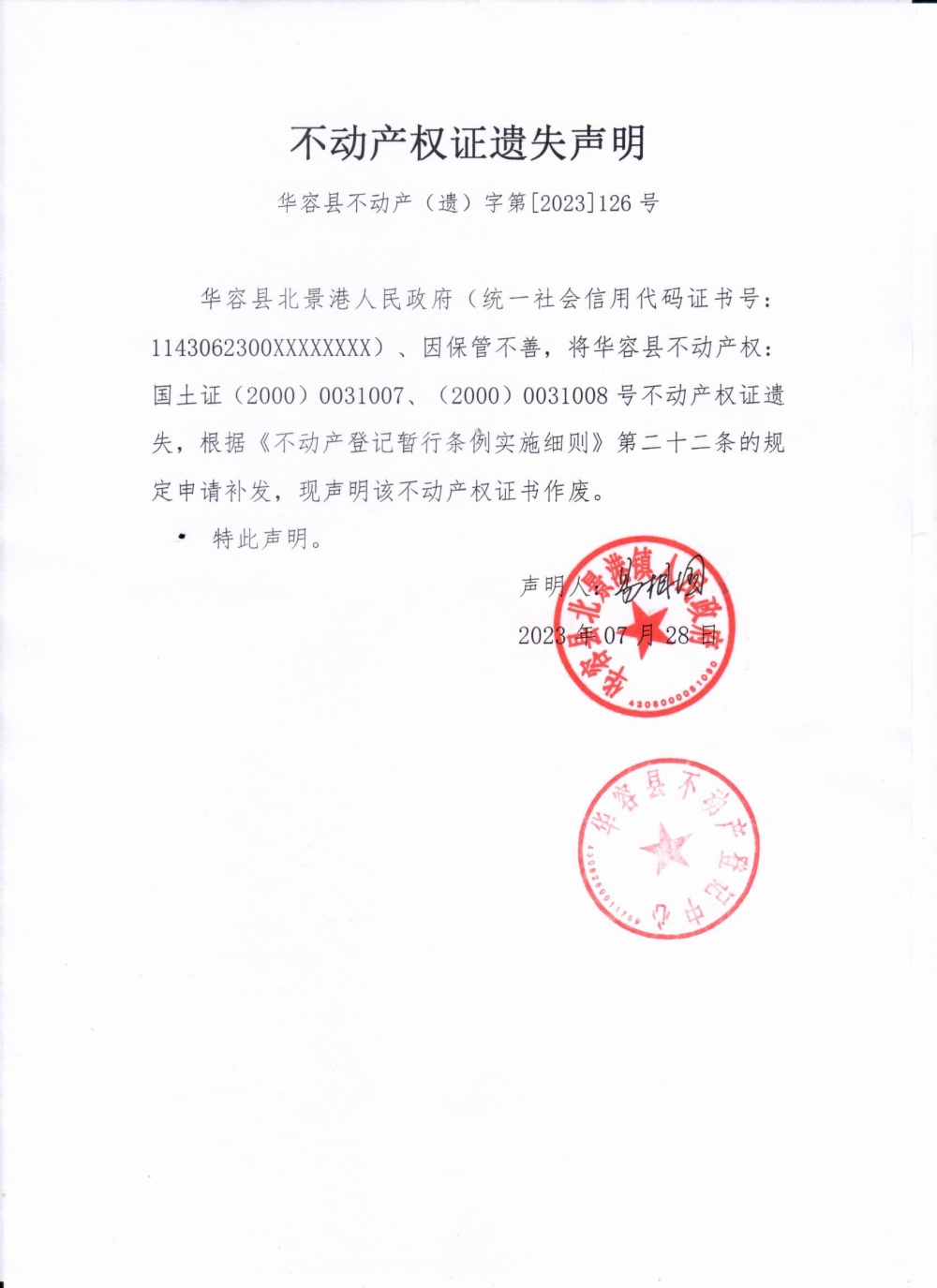 不动产权证遗失声明(华容县北景港镇人民政府)