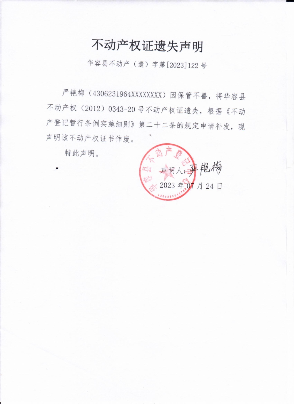 不动产权证遗失声明(严艳梅)