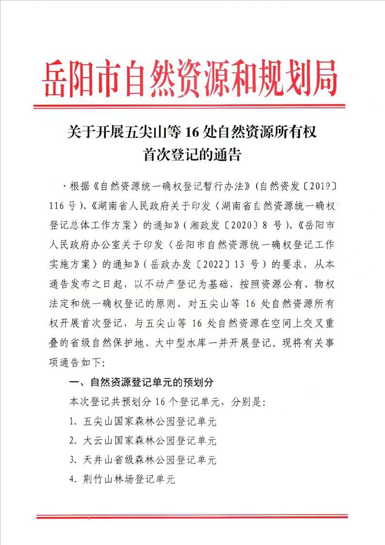 关于开展五尖山等16处自然资源所有权首次登记的通告