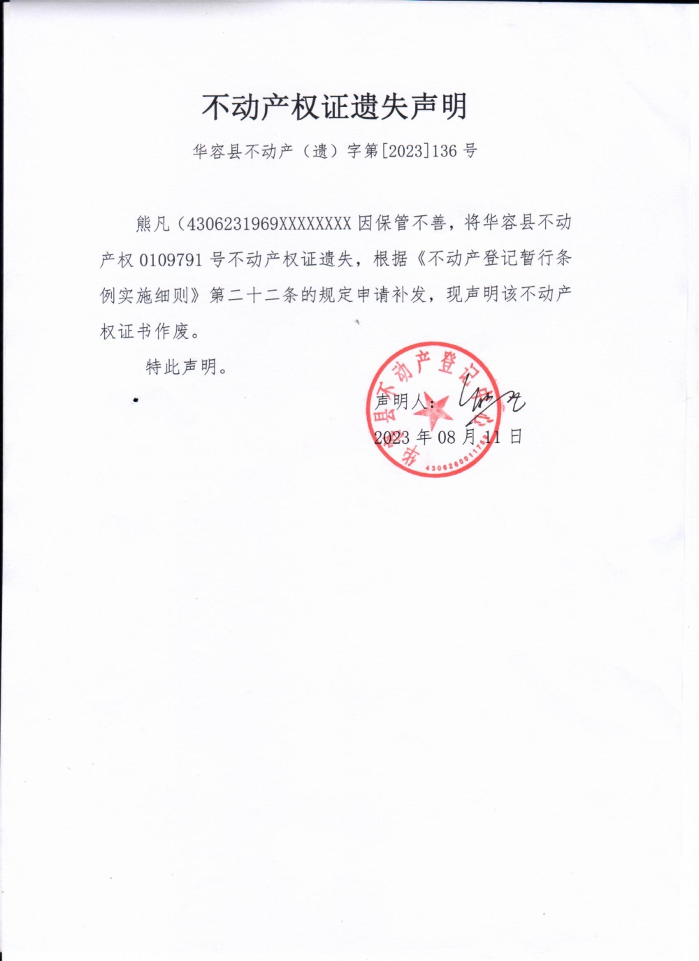 不动产权证遗失声明(熊凡)