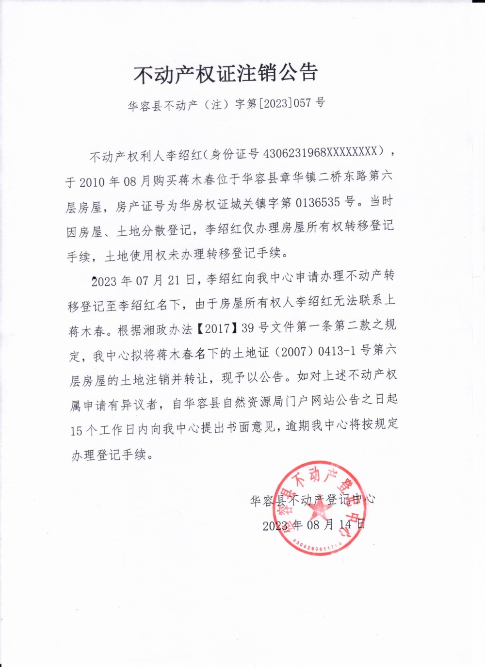 不动产权证注销公告(蒋木春转李绍红)