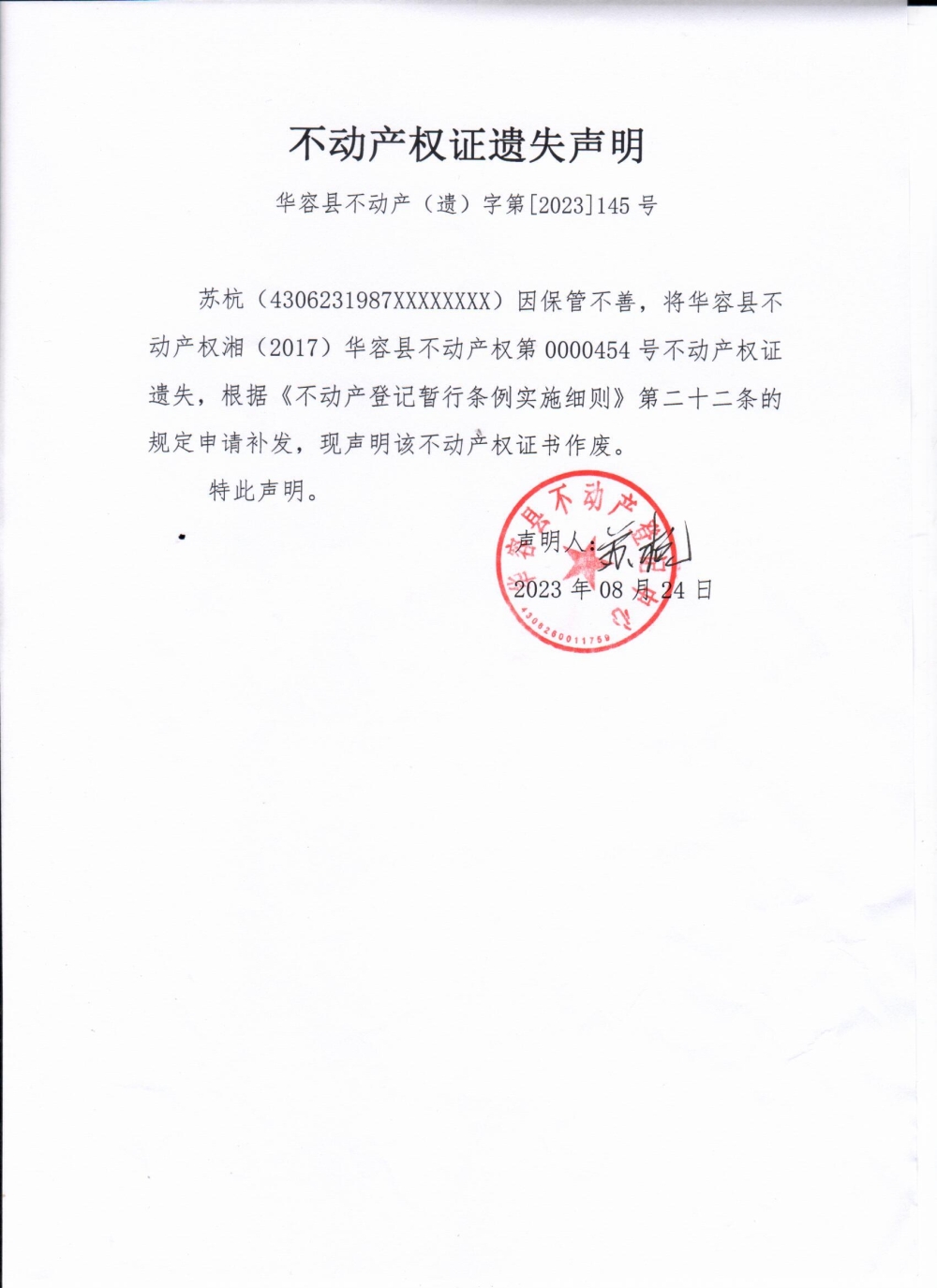 不动产权证遗失声明(苏杭)
