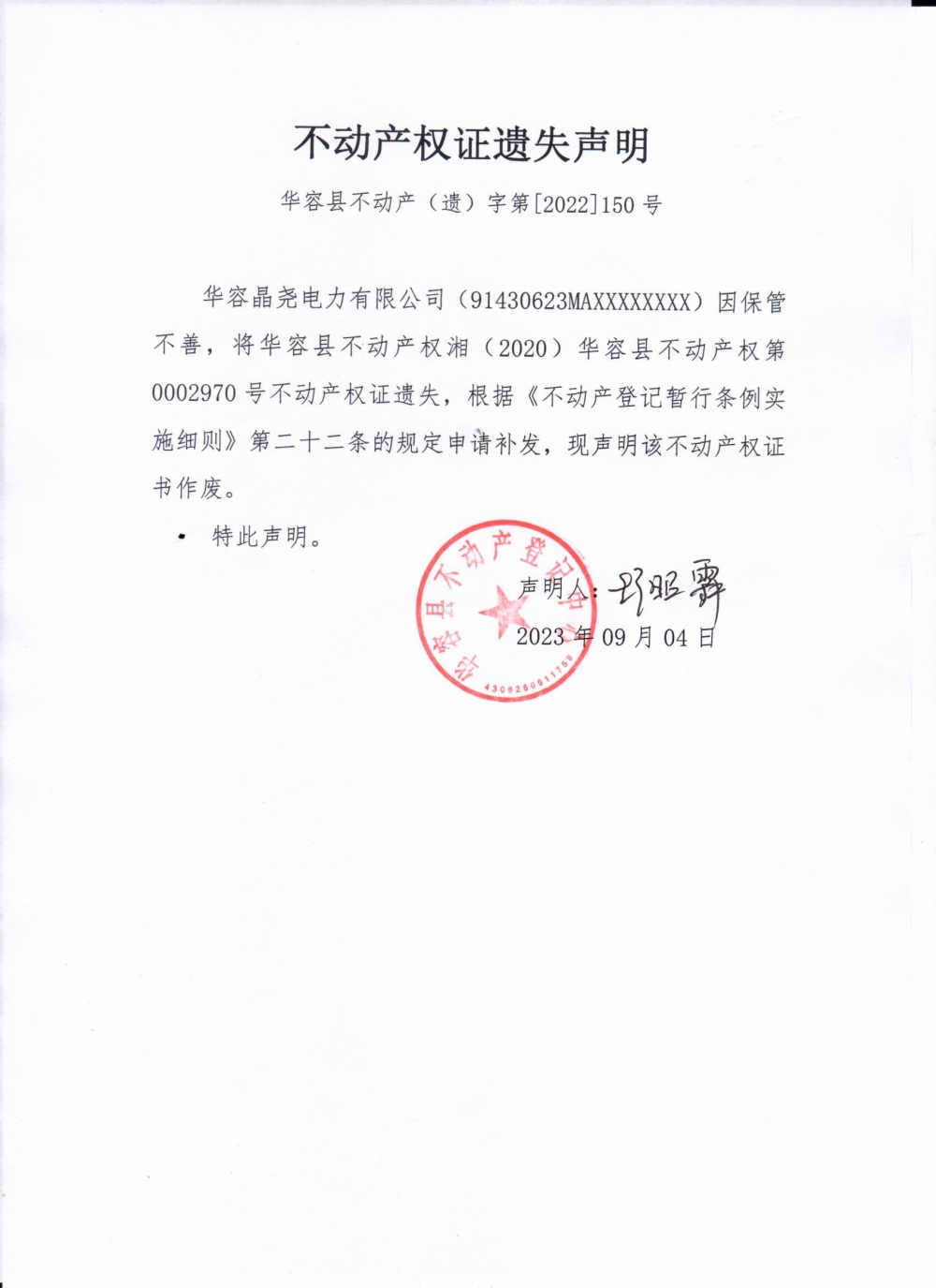 不动产权证遗失声明(华容晶尧电力有限公司)