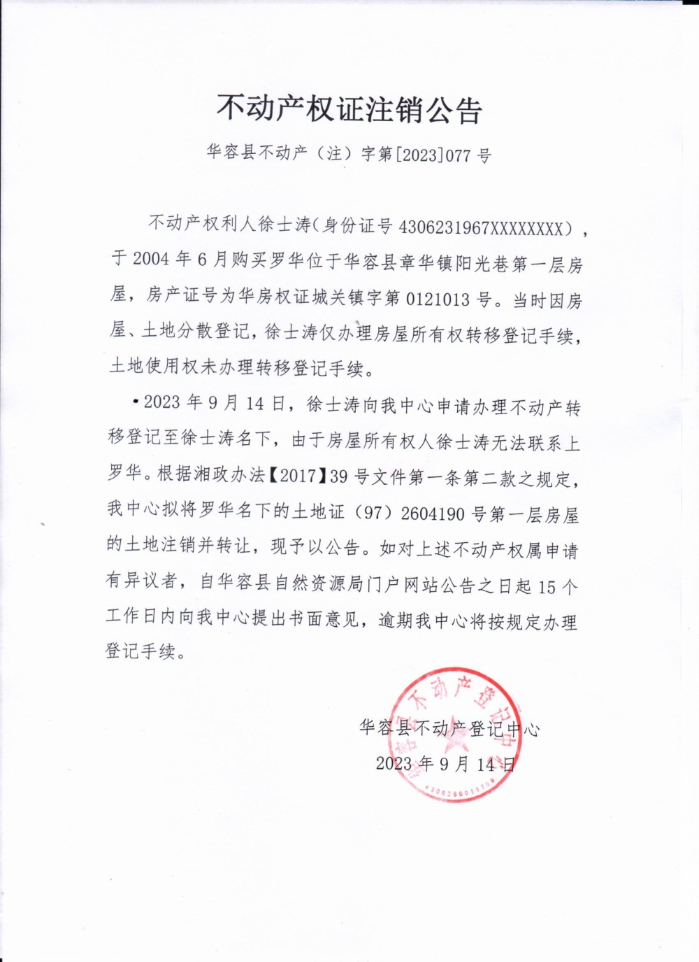 不动产权证注销公告(罗华转徐士涛)