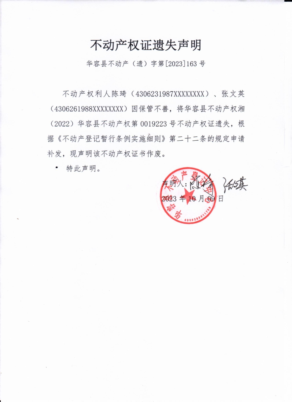不动产权证遗失声明(陈琦、张文英)