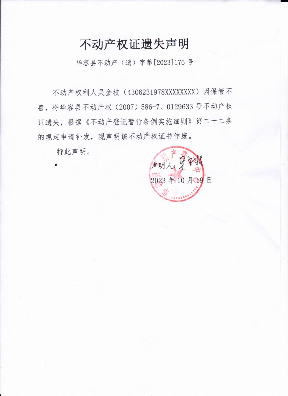 不动产权证遗失声明(吴金枝)