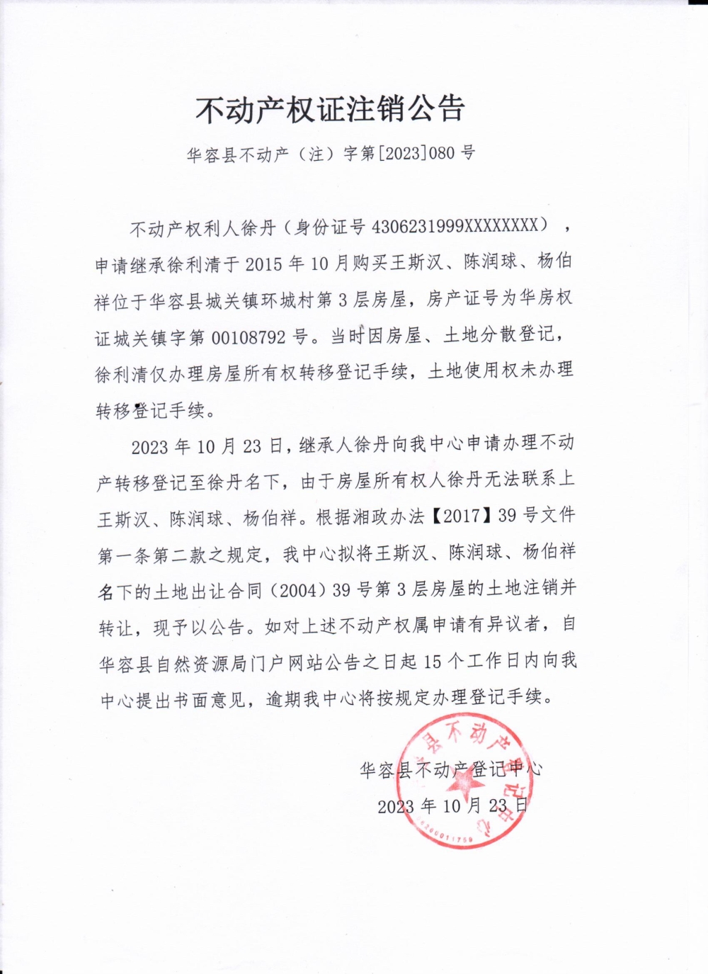 不动产权证注销公告(王斯汉、陈润球、杨伯祥转徐丹)