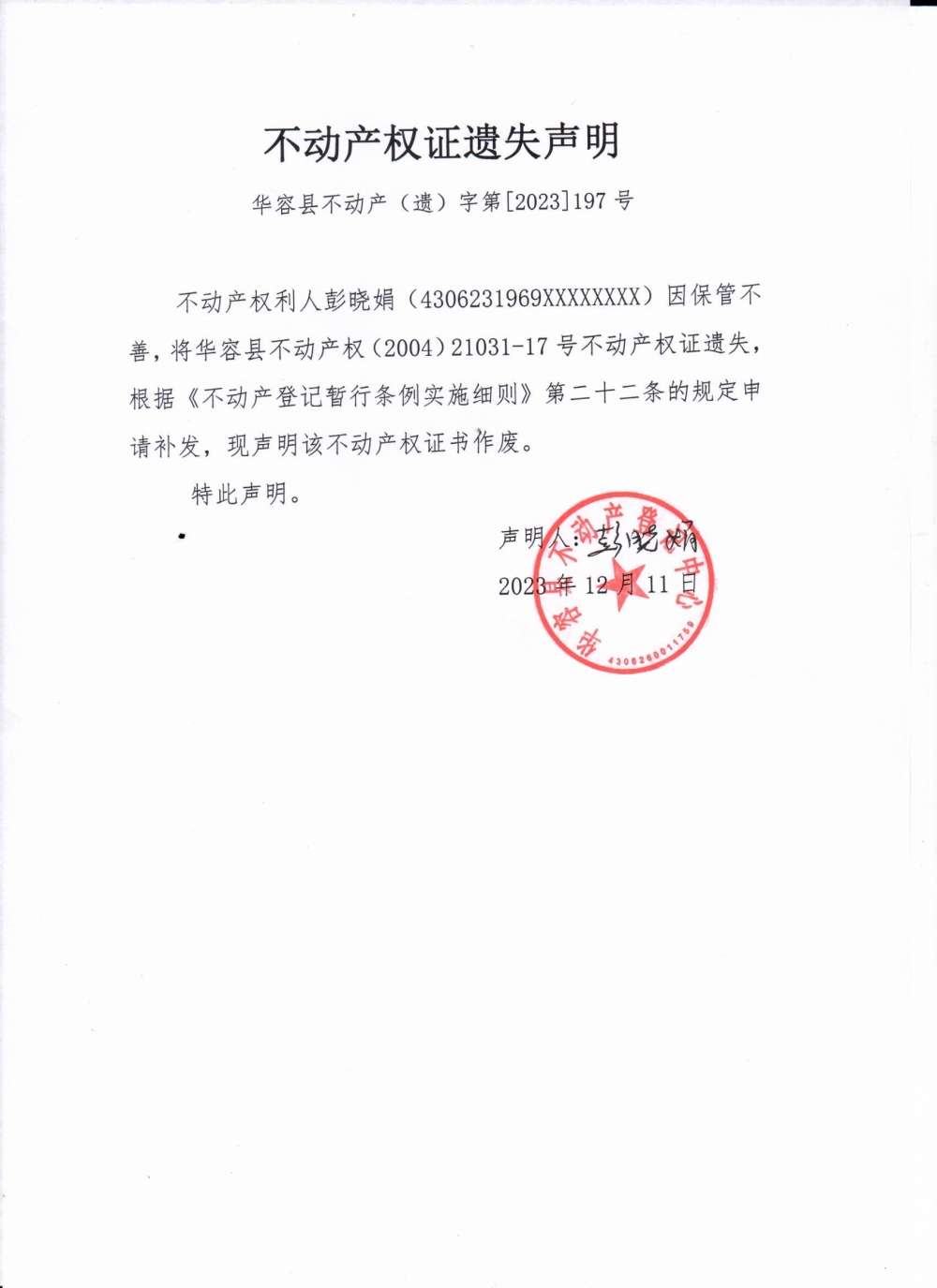 不动产权证遗失声明(彭晓娟)