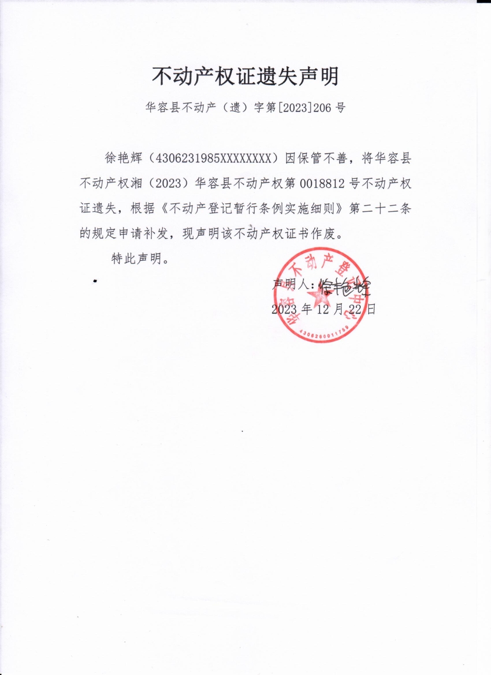 不动产权证遗失声明(徐艳辉)