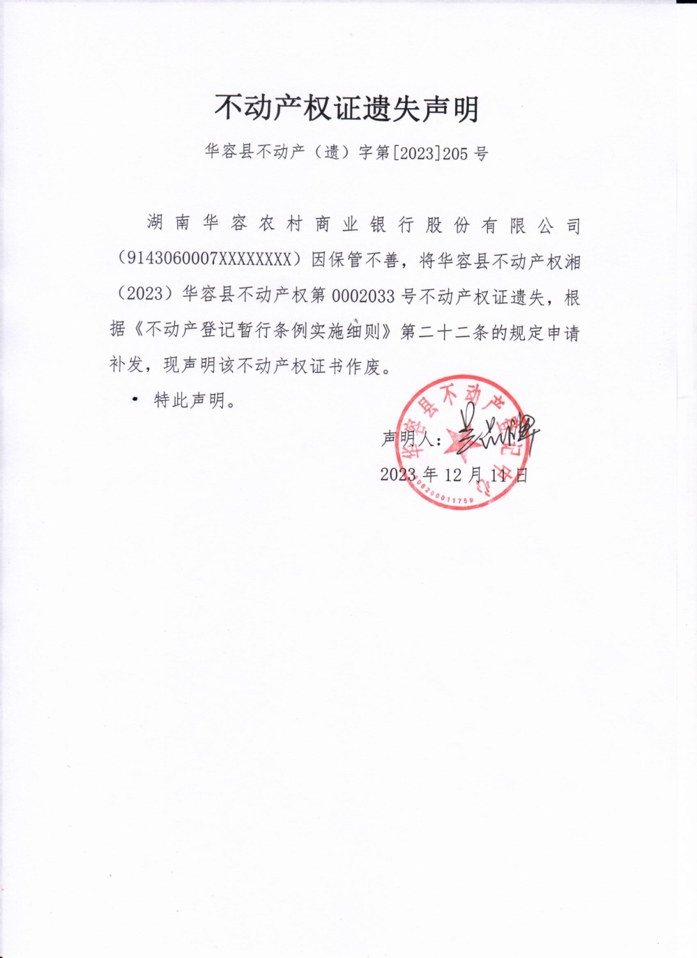 不动产权证遗失声明(湖南华容农村商业银行股份有限公司)