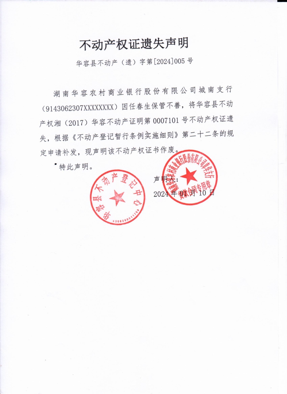 不动产权证遗失声明(湖南华容农村商业银行股份有限公司城南支行)