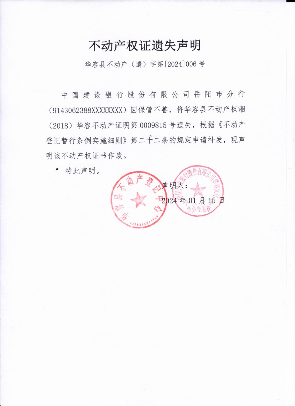 不动产权证遗失声明(中国建设银行股份有限公司岳阳市分行)