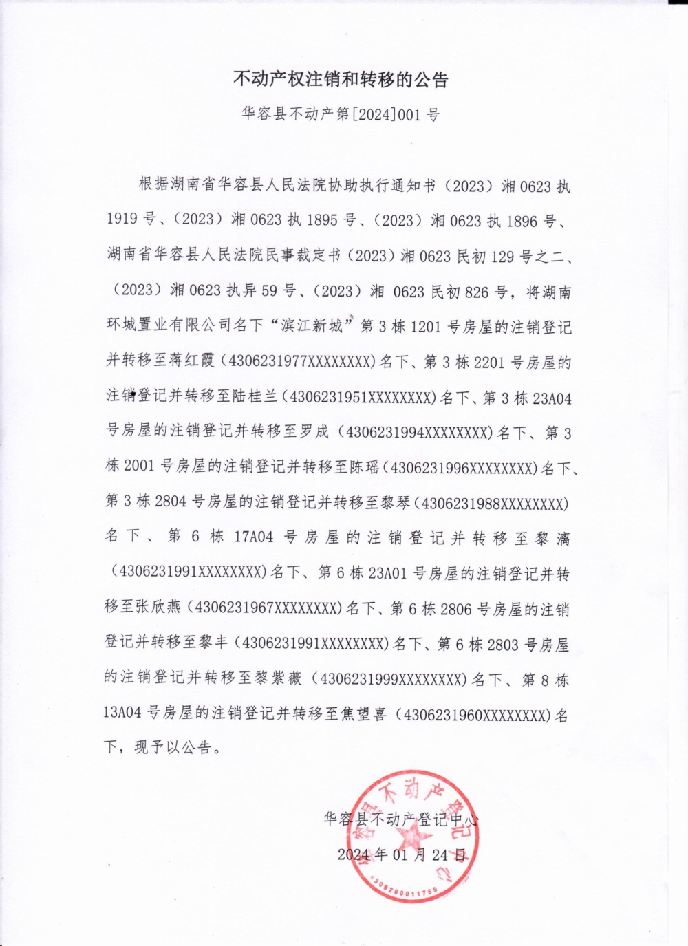 不动产权注销和转移的公告(滨江新城转蒋红霞、陆桂兰、罗成、陈瑶、黎琴、黎漓、张欣燕、黎丰、黎紫薇、焦望喜)