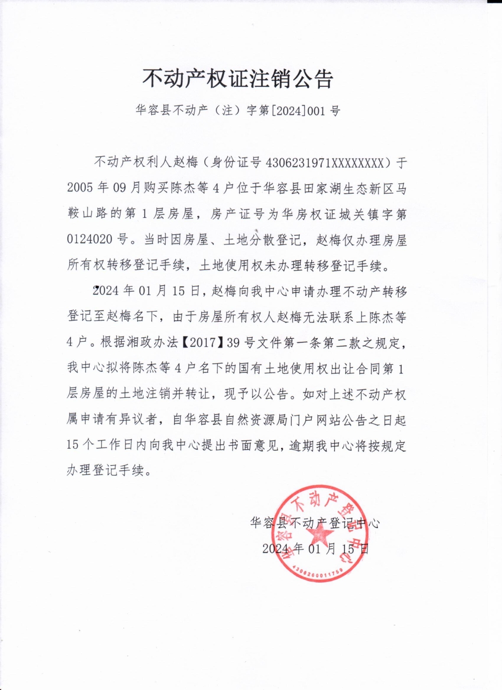不动产权证注销公告(陈杰等4户转赵梅)