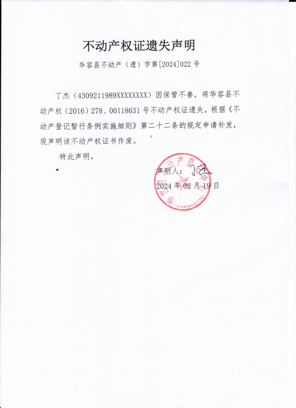 不动产权证遗失声明(丁杰)