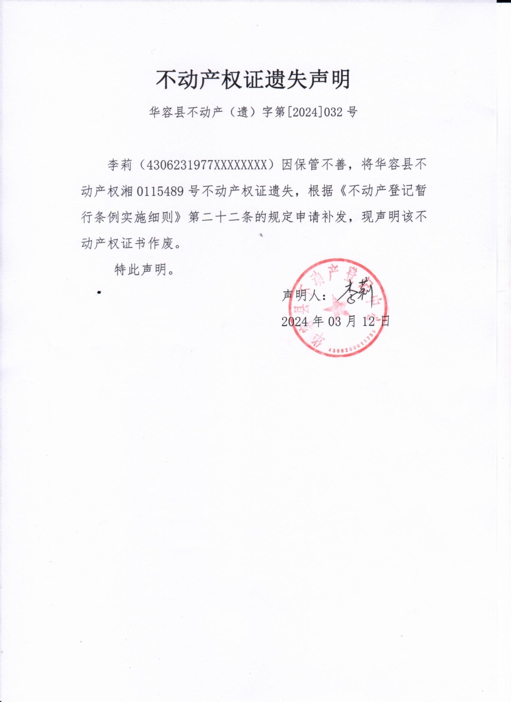 不动产权证遗失声明(李莉)