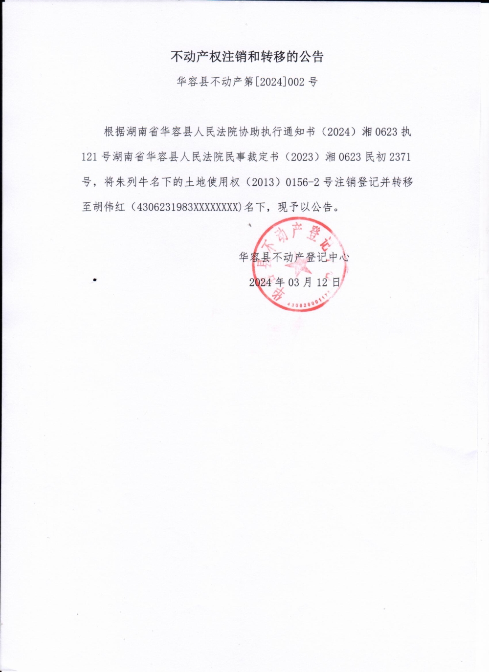 不动产权注销和转移的公告(朱列牛转胡伟红)