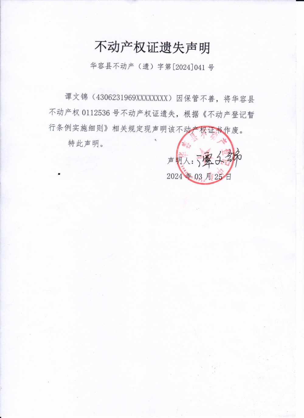 不动产权证遗失声明(谭文锦041)